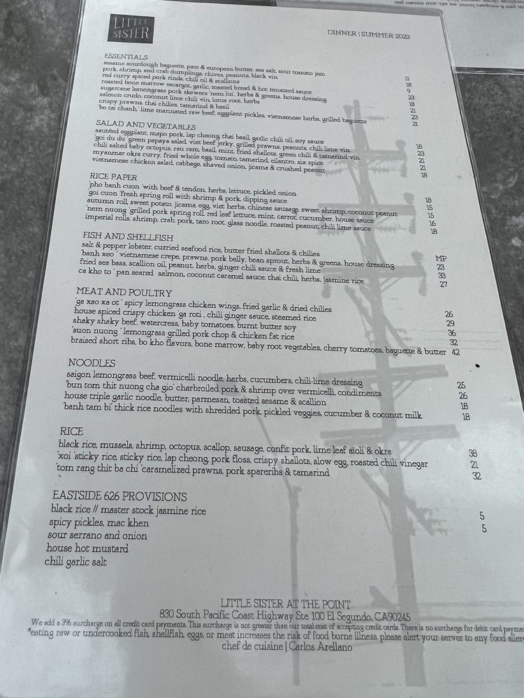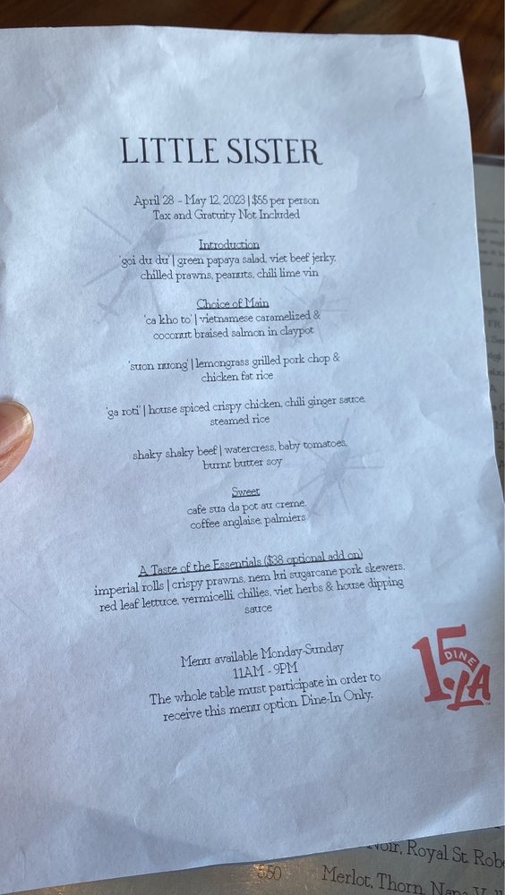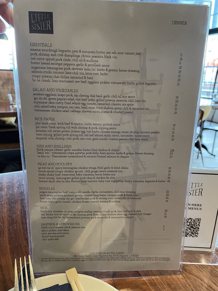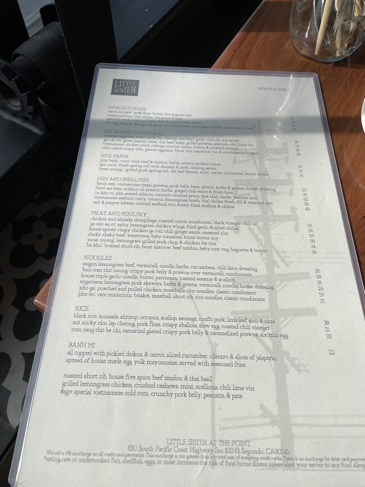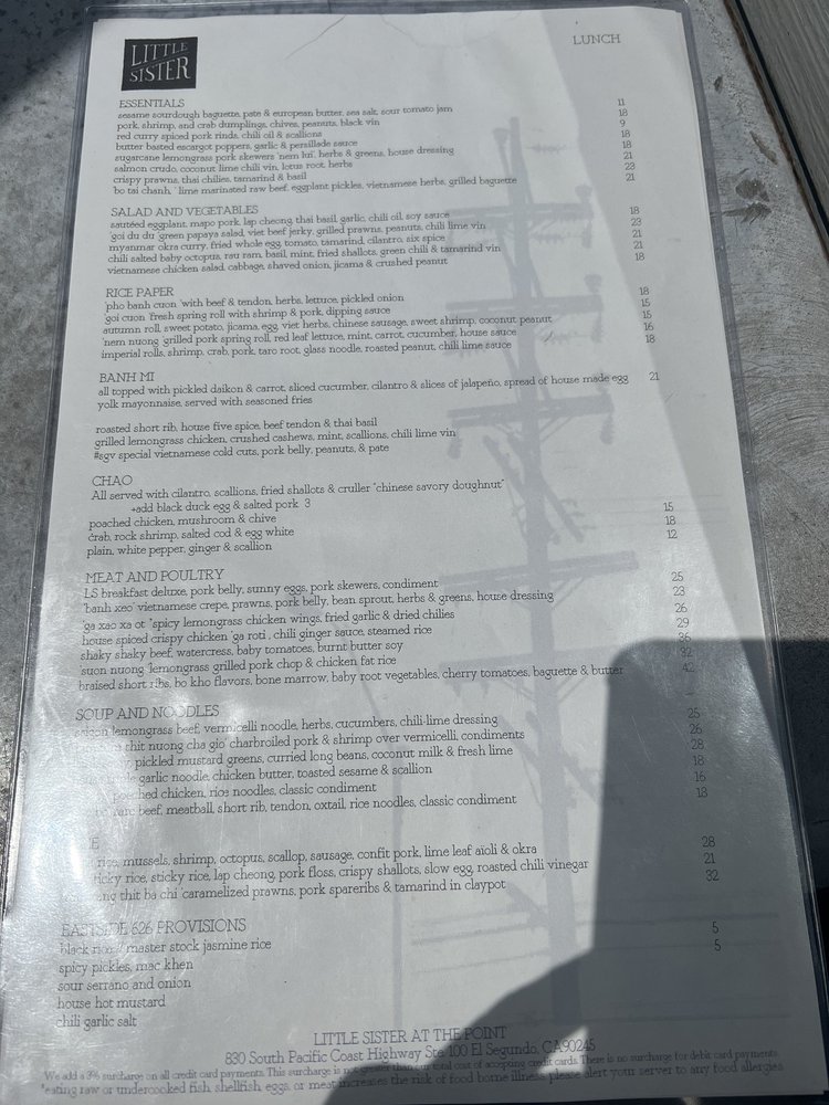 Introducing Little Sister, a Vietnamese restaurant in El Segundo, CA, known for its intimate space, trendy ambiance, and delicious fusion menu. Offering vegan and vegetarian options, along with unique dishes like Salmon Crudo and Pate Banh Mi, this spot caters to a variety of preferences. Customers rave about the flavorful dishes, such as the Lemongrass Grilled Pork Chop and the Pho Banh Cuon. The modern decor and efficient service make dining at Little Sister a pleasant experience. With ample parking and a convenient location at The Point shopping mall, this restaurant is a must-visit for those craving Vietnamese cuisine with a twist. Experience the elevated flavors and welcoming atmosphere at Little Sister for a satisfying dining experience.